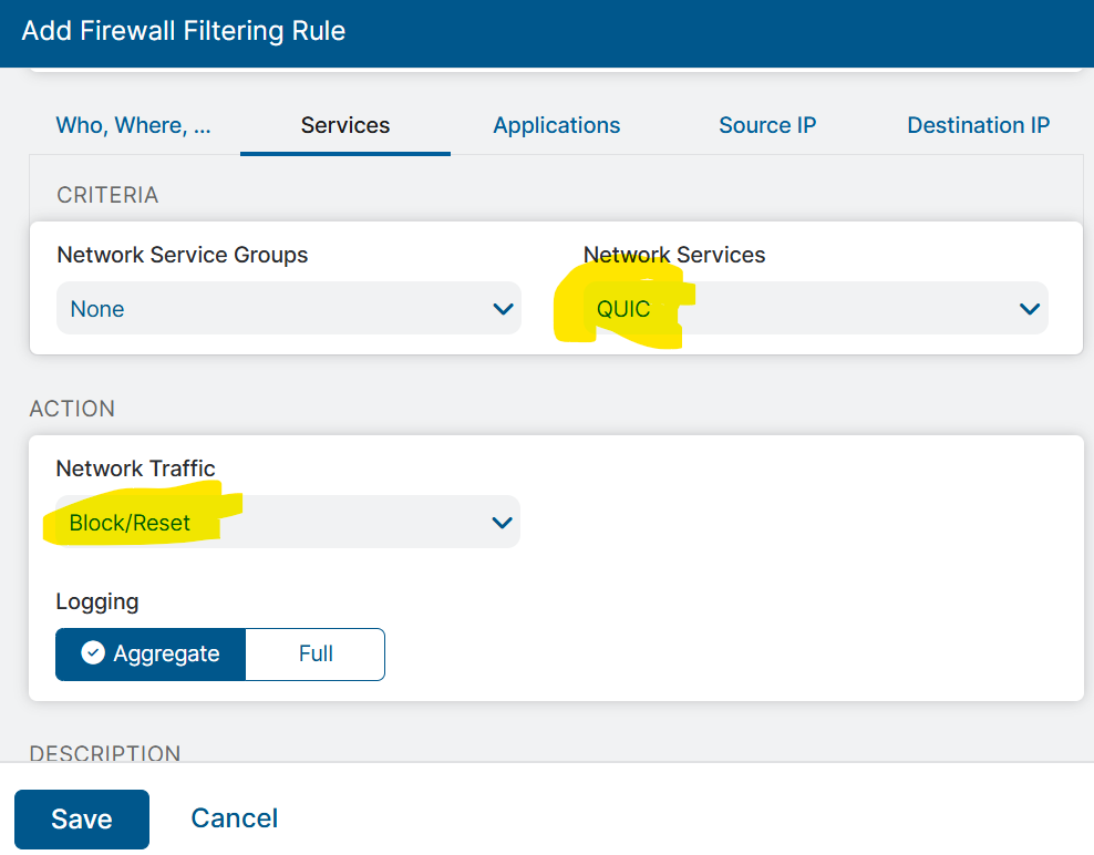 Step1: Block QUIC protocol in Firewall Filtering Rule
